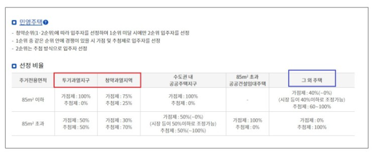 85m2 이하의 경우 - 가점제 40% 이하와 추첨제 60-100%의 비율로 선정이 됩니다.