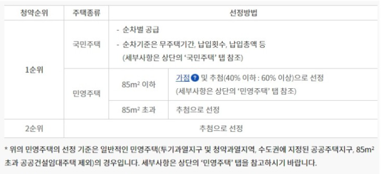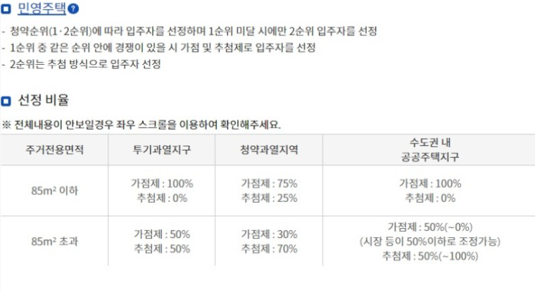 민영주택은 예치금 조건이 충족이 되어있을 때 가점제, 추첨제에 의해서 당첨 여부가 나뉘게 됩니다.
