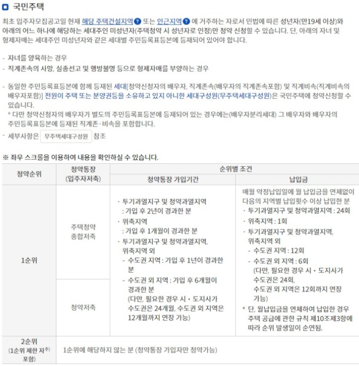 국민주택과 민영주택 각각의 주택청약 1순위 조건입니다.