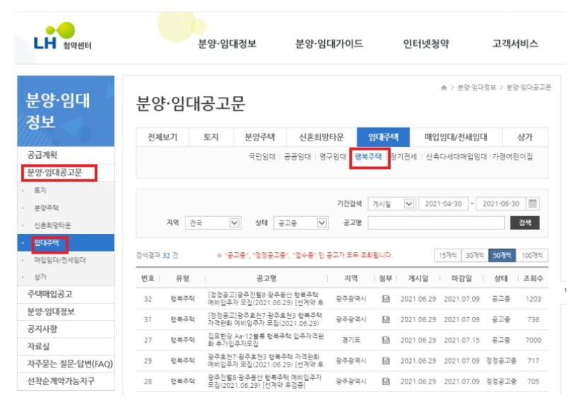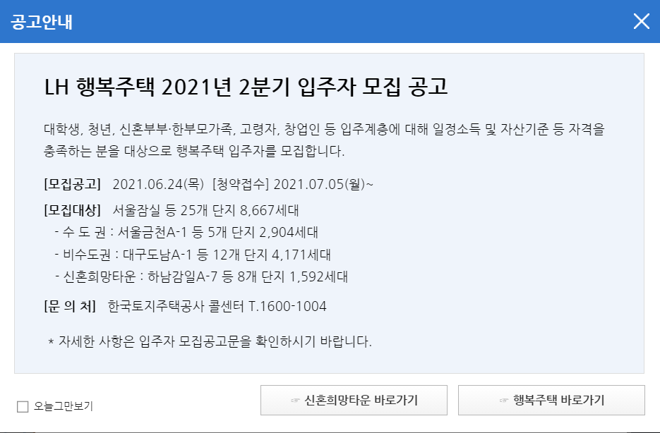 LH행복주택 2분기 입주자 모집 공고가 게시되었습니다. 모집공고 일이 2021년 6월 24일이므로 서류 준비는 24일 이후로 하시면 됩니다. 청약 접수 시작 날짜는 7월 5일 월요일입니다.