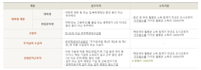 해당 세대 월평균 소득 합계가 전년도 도시근로자 가구원수별 가구당 월평균 소득의 100% 이하인자이며, 맞벌이는 120% 이하인 자면 가능합니다.
